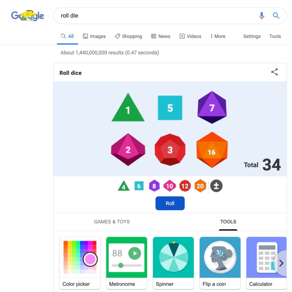 В Google Поиске есть ряд встроенных инструментов, для которых в противном случае потребовалось бы загружать отдельные приложения. Утилита «бросить кубик» получает значительное обновление, добавляющее многогранные кубики, при этом все инструменты теперь удобно перечислены.