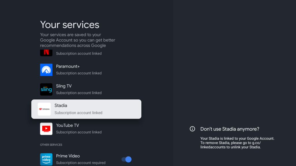 Обновление от 10.07: Как мы и надеялись, Chromecast с Google TV получил еще более глубокую интеграцию со Stadia. Как заметил ryandfc81 на сабреддите Stadia, Google TV теперь показывает «Недавно сыгранная игра» из Stadia в разделе «Главные рекомендации» вкладки «Для вас». В соответствии с этим, Stadia теперь также представлена на странице «Ваши сервисы» в настройках Google TV. По нашим тестам, эта более глубокая интеграция Stadia появилась после перезагрузки.