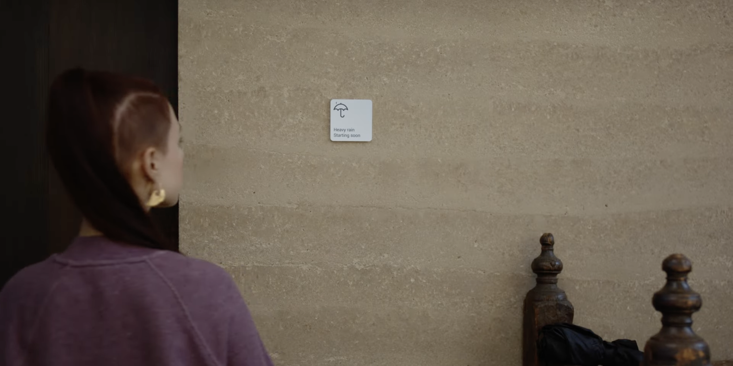 На практике компания продемонстрировала настенный умный дисплей квадратной формы, который установлен у входной двери дома. Когда никого нет, он в основном показывает температуру, при этом прогноз также отображается, но меньшим шрифтом. При приближении прогноз занимает весь экран.