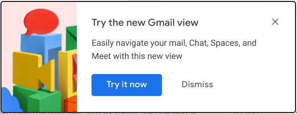 Если это не сработает, нажмите значок шестеренки настроек в правом верхнем углу и выберите «Вернуться к оригинальному виду Gmail». Затем вернитесь к быстрым настройкам и выберите «Попробовать новый вид Gmail». Это должно помочь. Сегодня это появилось в двух наших аккаунтах Google Workspace, но пока ни в одном из личных.