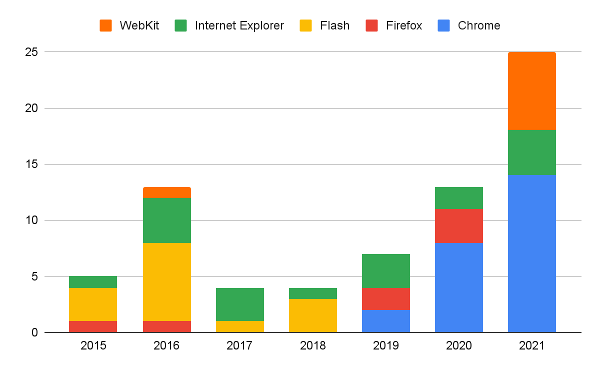 Данные, собранные командой Google Project Zero — включая подробную электронную таблицу — показывают, что количество уязвимостей нулевого дня, нацеленных на Chrome, увеличилось с 2019 года. Команда безопасности Chrome указывает на четыре основные причины этой тенденции: от возросшей прозрачности поставщиков до того, как «браузеры всё больше отражают сложность операционных систем» с расширенными возможностями, такими как доступ к оборудованию.
