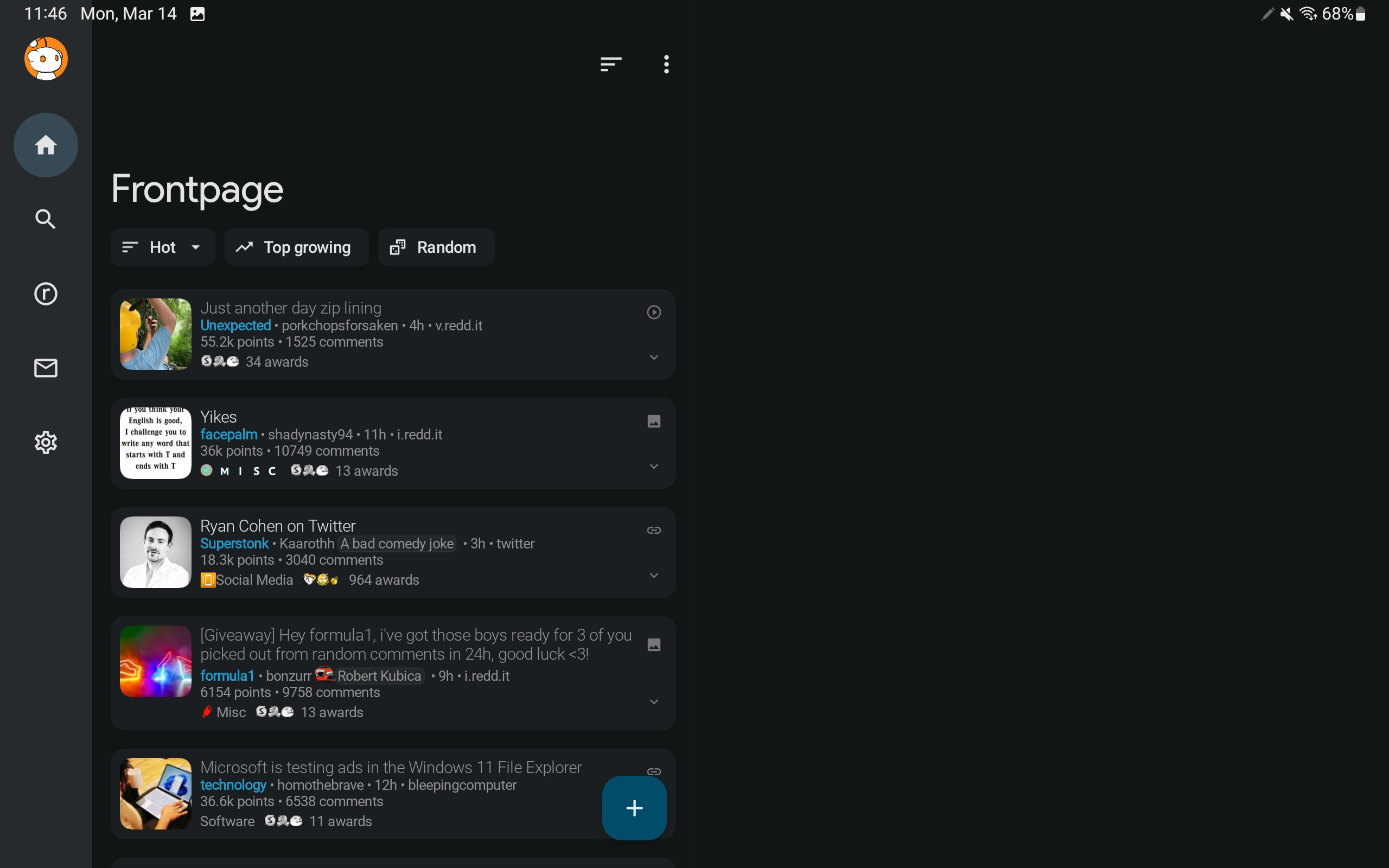 Ранее сегодня версия 22.3.14 (dev-релиз) представила планшетный режим, который начинается с левой навигационной панели. По сравнению с нижней панелью, вкладки «Посты» (Posts), «Поиск» (Search), «Сабреддиты» (Subs) и «Входящие» (Inbox) дополняются переключателем профилей и «Настройками» (Settings).