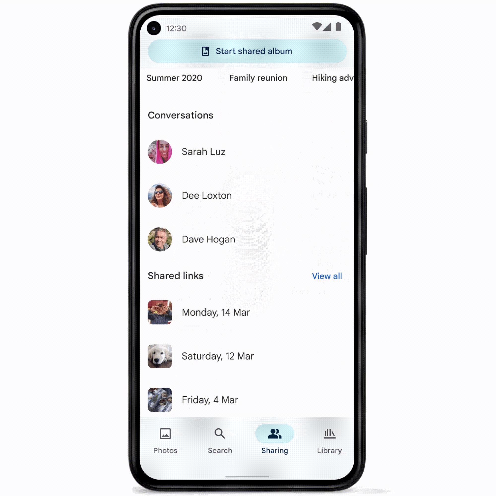 Google также значительно упростил вкладку «Обмен» в Фото. Прежний скучный список теперь разделен на три отдельных раздела. Присутствует карусель «Общих альбомов», а списки ниже показывают три ваших последних «Беседы» и «Общие ссылки».