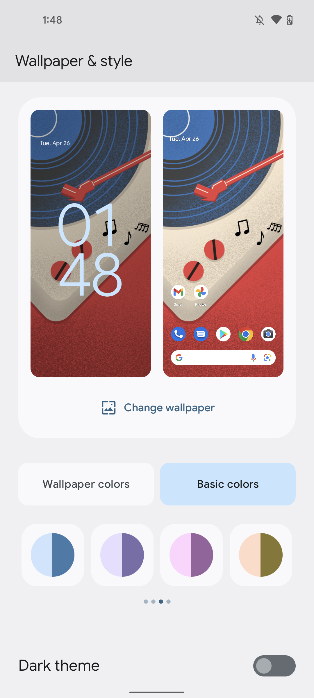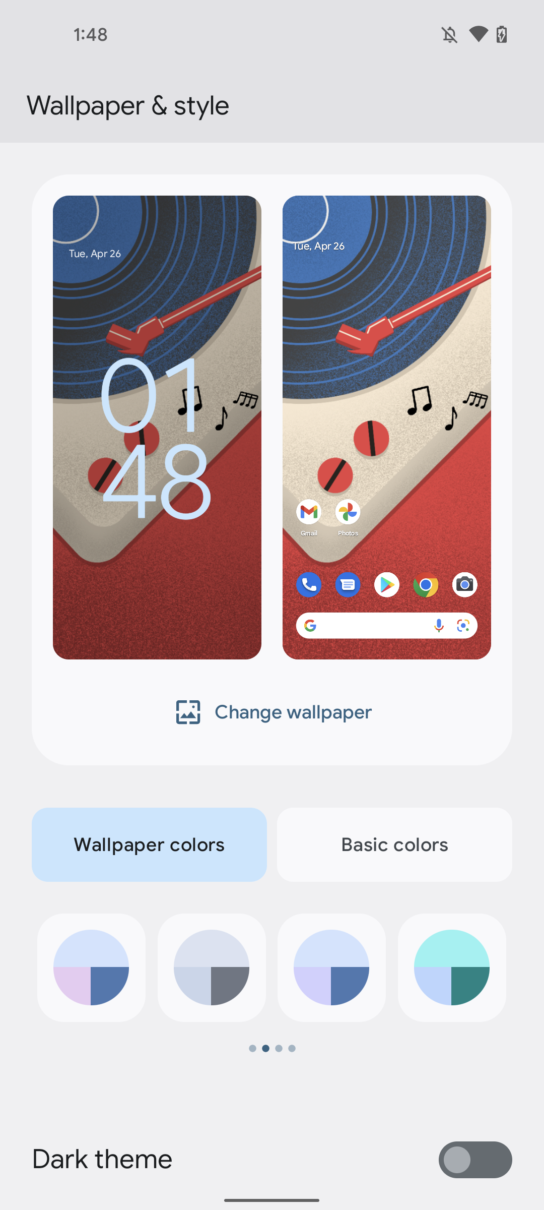 Судя по всему, вам предлагается ряд вариантов, основанных на определенном наборе цветов в ваших обоях. Для каждого набора цветов вы можете выбрать один из четырех различных стилей цветовых тем Material You, хотя забавные названия этих стилей (Spritz, Fruit Salad и т. д.) сегодня не отображаются в настройках.