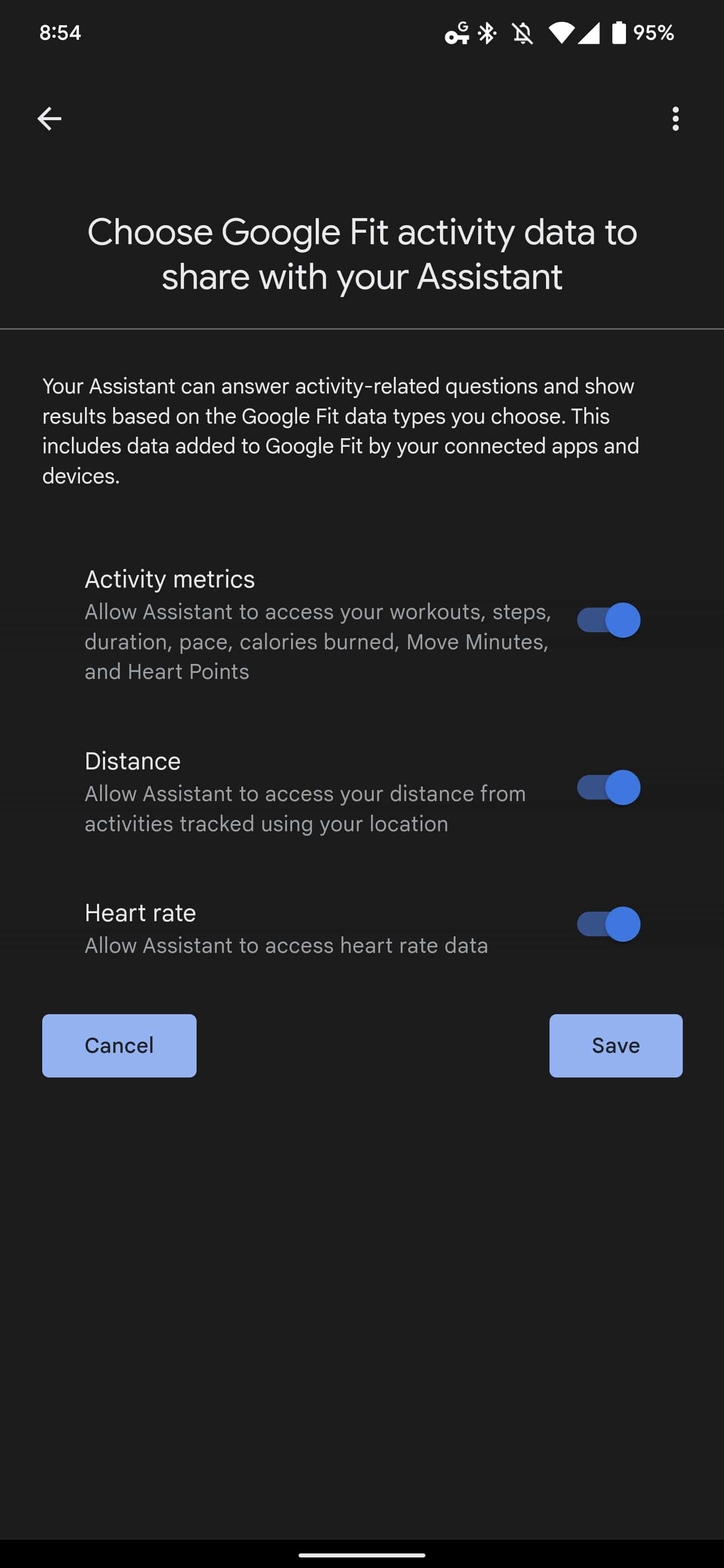 - Метрики активности: Разрешить Assistant доступ к вашим тренировкам, шагам, продолжительности, темпу, сожженным калориям, минутам движения и очкам сердечного ритма