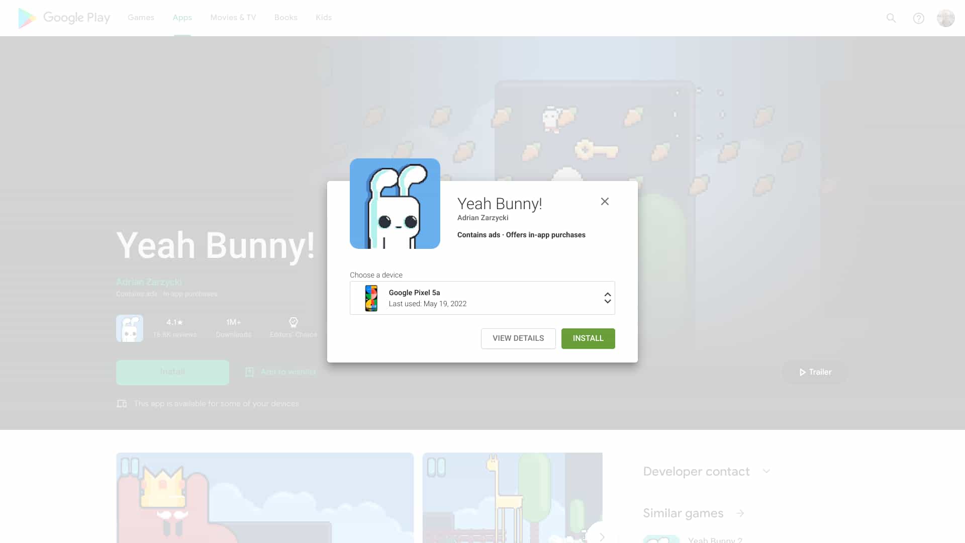 При просмотре страницы приложения теперь вверху есть большой раздел, где на размытом фоне указаны ключевые детали (рейтинг/отзывы, количество загрузок и возрастное ограничение). Это очень похоже на Play Игры для ПК. Кнопка «Установить» появляется ниже, хотя само всплывающее окно и список «Выберите устройство» не были существенно модернизированы.