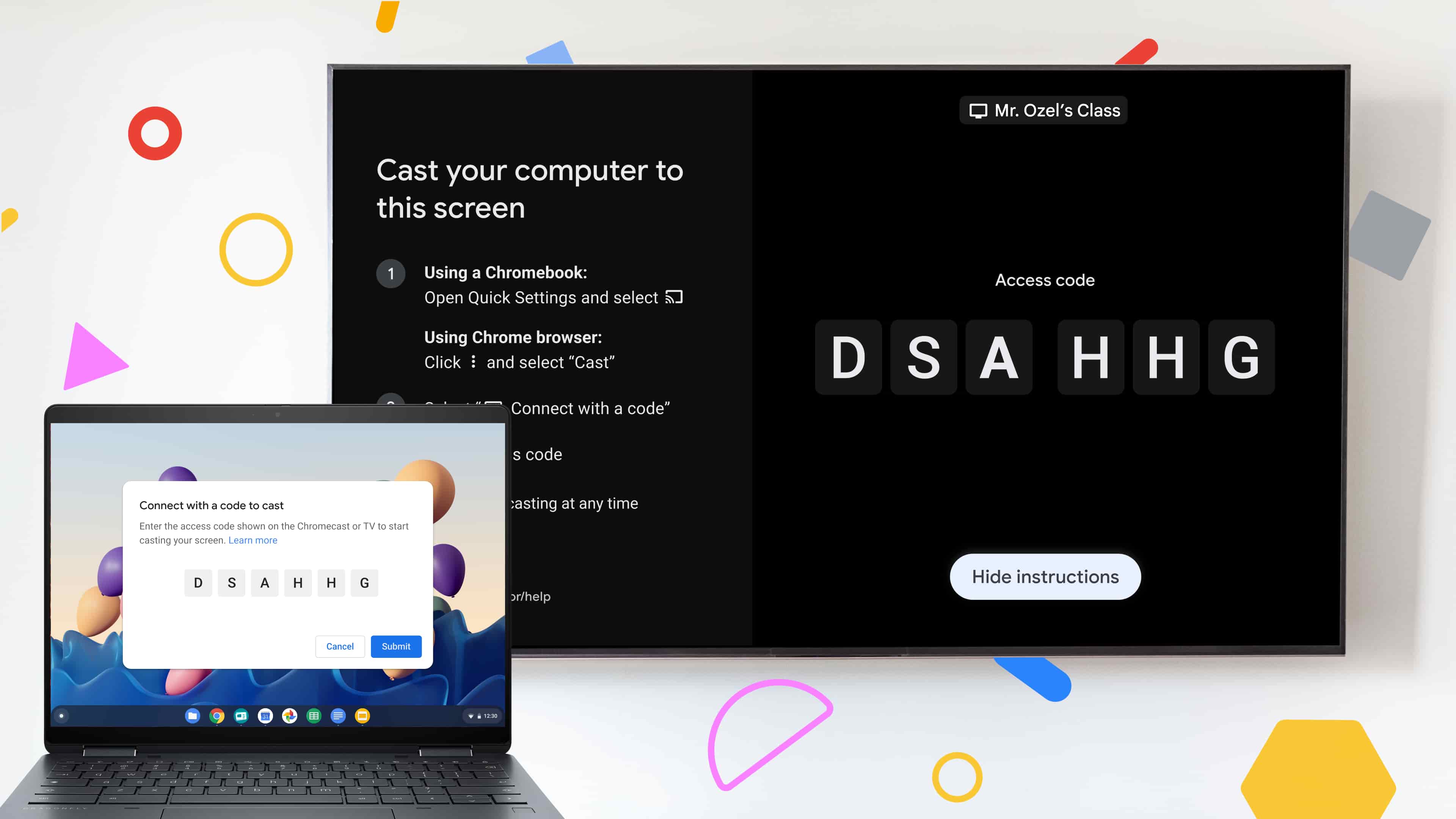 Ещё одно крупное обновление — это функция «Cast moderator» для «безопасной беспроводной трансляции», специально разработанная для использования в классах. Учителя и ученики могут транслировать экран своего Chromebook или браузера Chrome с компьютера на поддерживаемое устройство Google TV, которое будет отображать шестизначный код доступа для предотвращения нежелательной или случайной трансляции экрана.