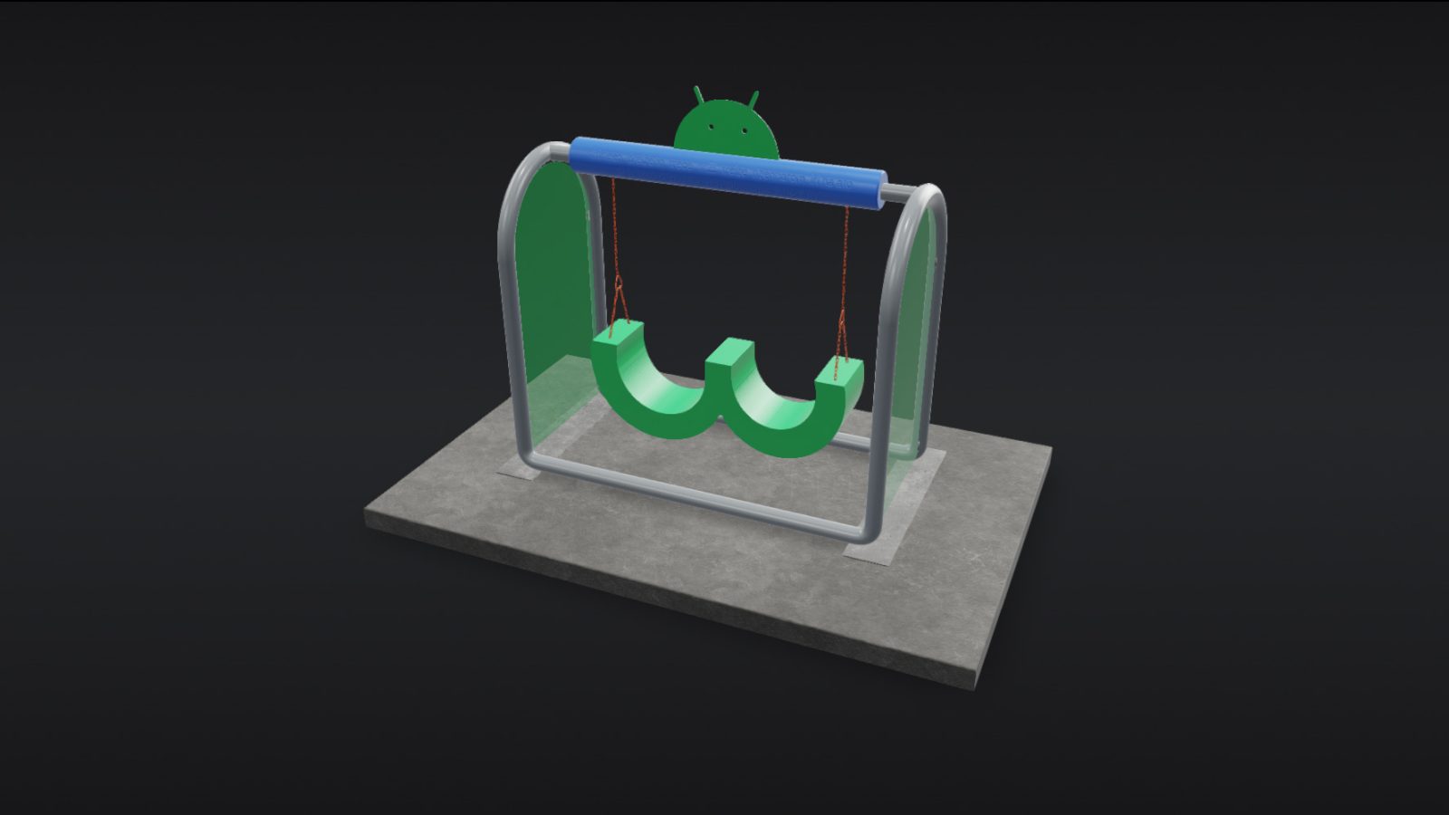 Тема Google для статуи Android 13 — это качели, где верхняя синяя перекладина, от которой отходят металлические цепи, представляет собой «1», а зеленая скамейка — лежащую на боку «3». На верхней части, где находится голова Android, написано «thirteen» на 13 языках, в том числе в 4-битном двоичном коде (1101).