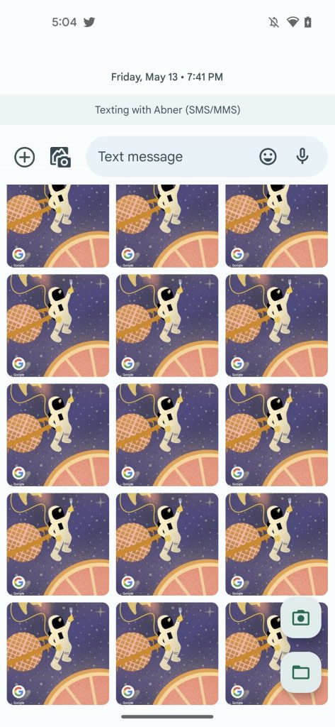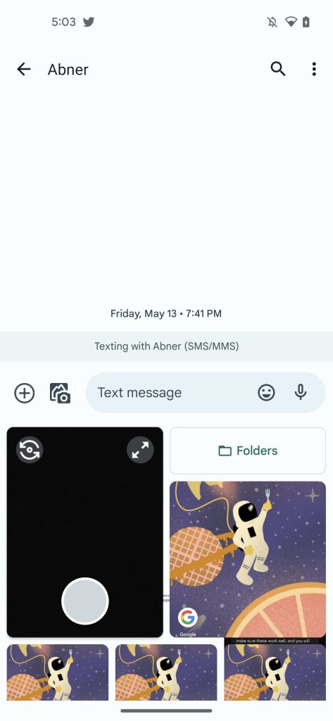 В новом дизайне, который мы включили, вы теперь можете прокручивать фотографии вертикально, даже используя большую часть экрана при прокрутке, для менее тесного опыта. Старая кнопка «Галерея» заменена опцией «Папки», которая предлагает по сути тот же опыт. В целом, редизайн фотогалереи Google Messages, особенно его плавающие кнопки действий в углу, хорошо сочетается с Material You.