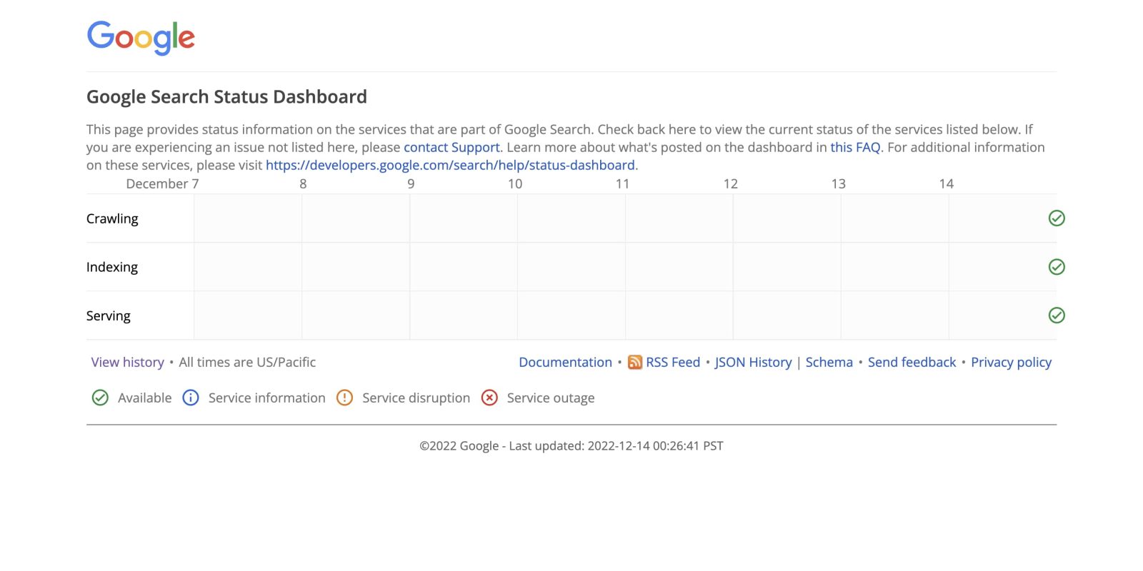 Три основные системы Поиска перечислены как Сканирование, Индексирование и Выдача. Google «опубликует инцидент на панели в течение часа и последующие обновления инцидента в течение 12 часов». Это не автоматизировано; отчеты и обновления поступают от сотрудников, расположенных по всему миру.