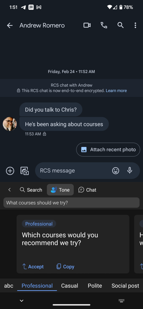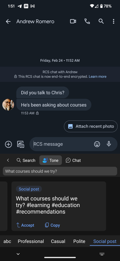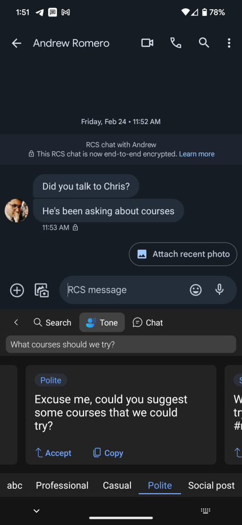 Это проявляется двумя способами: во-первых, новый параметр «Тон». С его помощью вы можете написать свое сообщение в SwiftKey, а затем попросить ИИ переписать его одним из нескольких способов. Варианты включают: