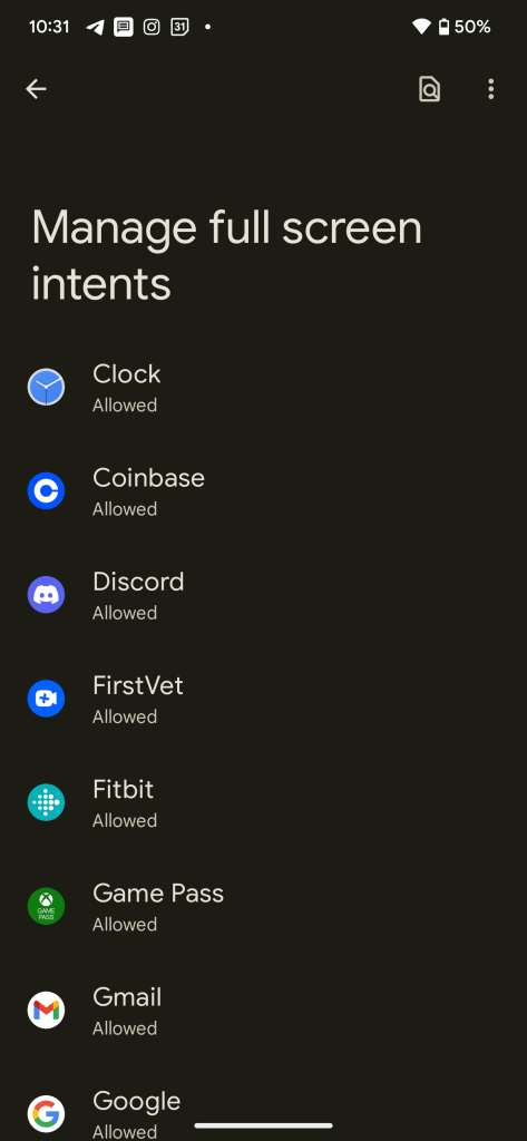 В разделе «Специальный доступ к приложениям» в Android 14 Beta 1 появилась новая настройка для управления «полноэкранными намерениями». Это разрешение позволяет пользователям предоставлять или запрещать приложениям отображать содержимое уведомлений в полноэкранном режиме, например, будильники и напоминания о встречах, а также звонки и тому подобное.