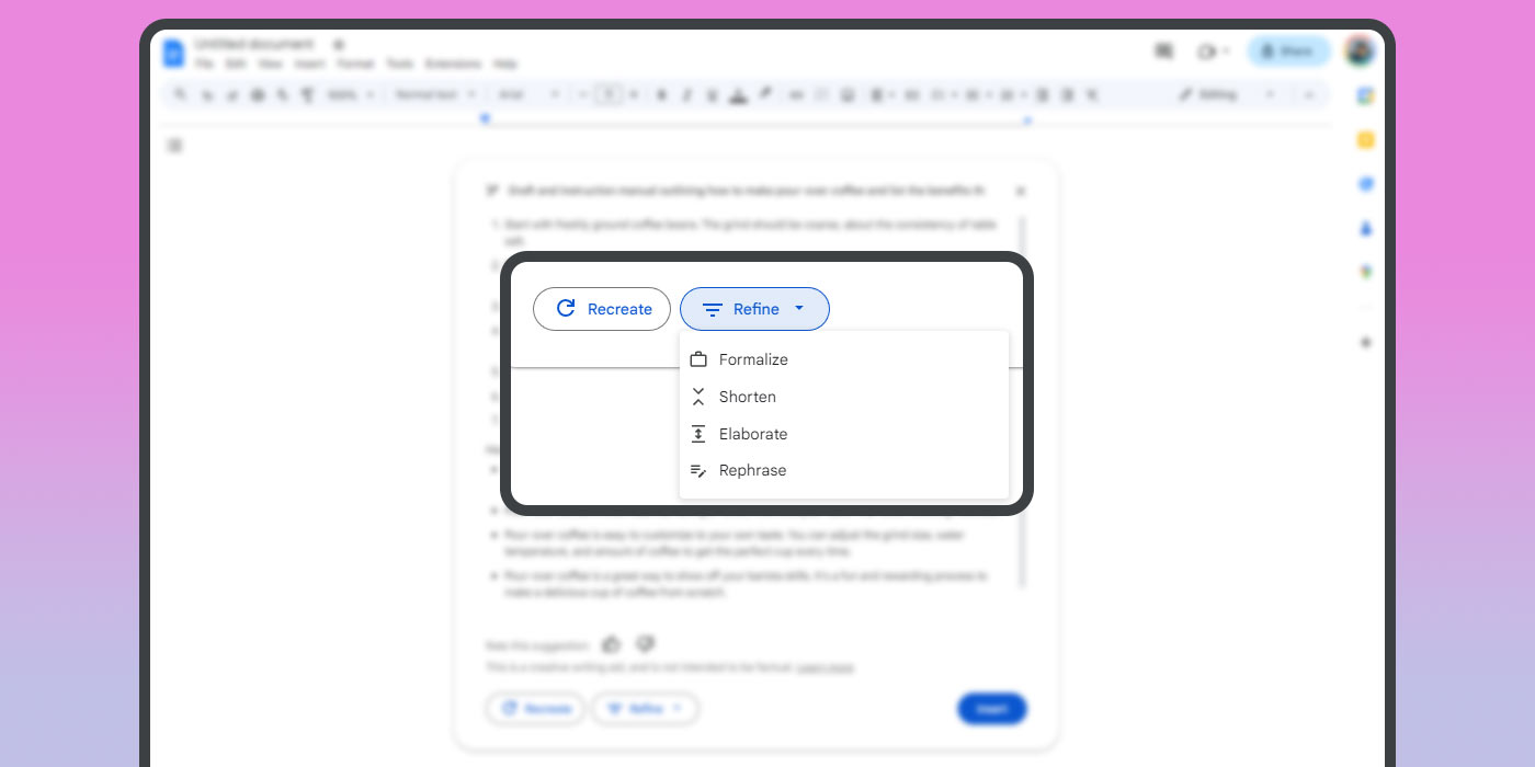 - Если вы выберете «Улучшить», вы можете выбрать несколько дополнительных опций: Сделать официальным, Сократить, Расширить и Перефразировать. Экспериментируйте с каждой из них, чтобы увидеть, как они влияют на ваш текст.
