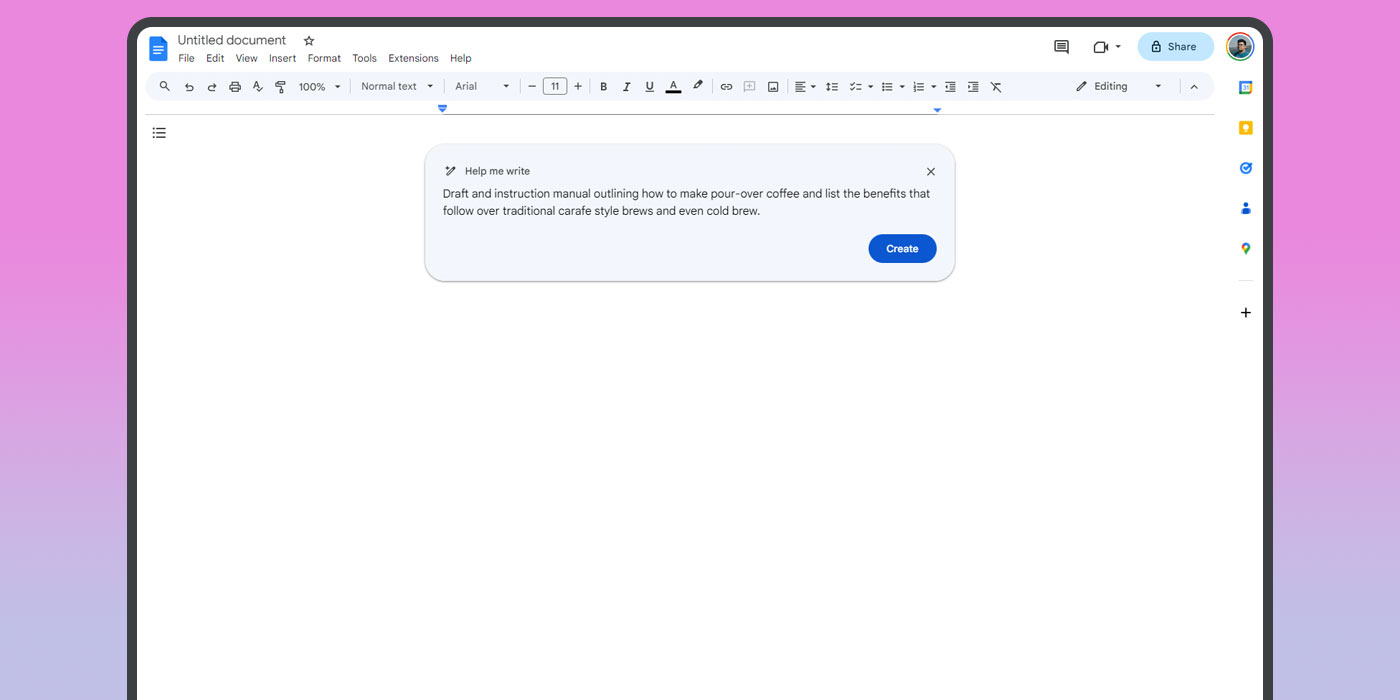 После того как вы зарегистрируетесь для Duet AI, вам не придется долго ждать приглашения в программу — от нескольких часов до пары дней после регистрации. Когда вы получите доступ, у вас будет доступ к генеративному ИИ-помощнику Google Docs и новой функции, которая позволяет вам задавать модели практически любую задачу.