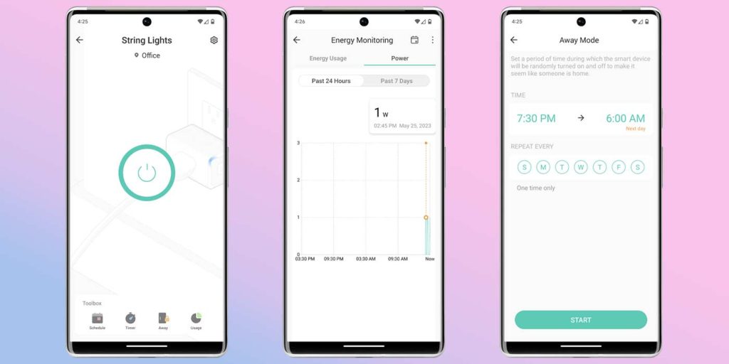 После продолжительного использования вы начнете видеть статистику энергопотребления в приложении Kasa. Это полезно, если вы используете что-то более мощное и хотите отслеживать, сколько стоит электроэнергия для этого устройства. Приложение Kasa позволяет пользователям вводить сумму в долларах за кВт⋅ч, что дает хорошее представление о потребляемой энергии в денежном эквиваленте. Приложение также предлагает режим «В отъезде», который случайным образом включает/выключает ваши огни, пока вас нет дома, «чтобы создать видимость присутствия кого-то дома».