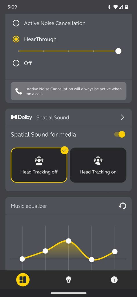 На Android удобство использования идет еще дальше благодаря уведомлению о бесшумном управлении в приложении Jabra Sound+. Это уведомление представляет собой просто строку состояния в нижней части панели уведомлений, отображающую быструю информацию, такую как использование отслеживания головы и Dolby Atmos. Быстрое развертывание позволяет легко переключать режимы ANC и сквозного пропуска.