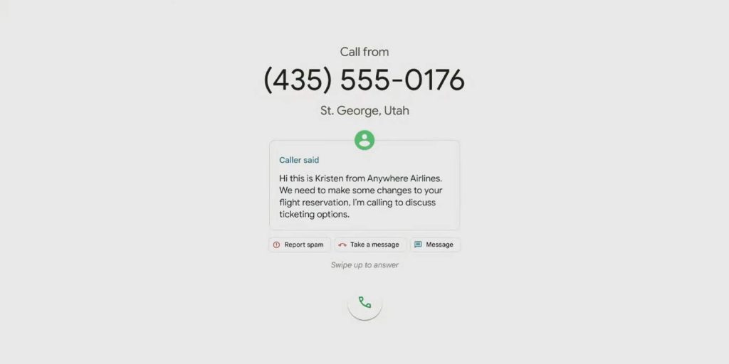Однако, если звонит, например, авиакомпания и четко сообщает, о чем идет речь, ИИ-помощник попытается соединить вас, зная, что звонок, скорее всего, легитимный. Вы увидите сводку ответа звонящего вместе с опциями «Сообщить о спаме», «Принять сообщение» или «Ответить сообщением».