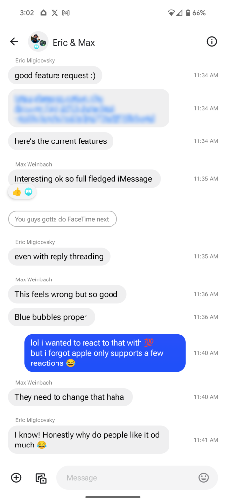На самом деле, единственное, что пока не работает и, вероятно, не будет работать в течение долгого времени, это обмен текущим местоположением, эффекты сообщений и интеграция с FaceTime. Есть надежда на FaceTime, но Beeper говорит, что игры iMessage «скорее всего, никогда не будут поддерживаться».