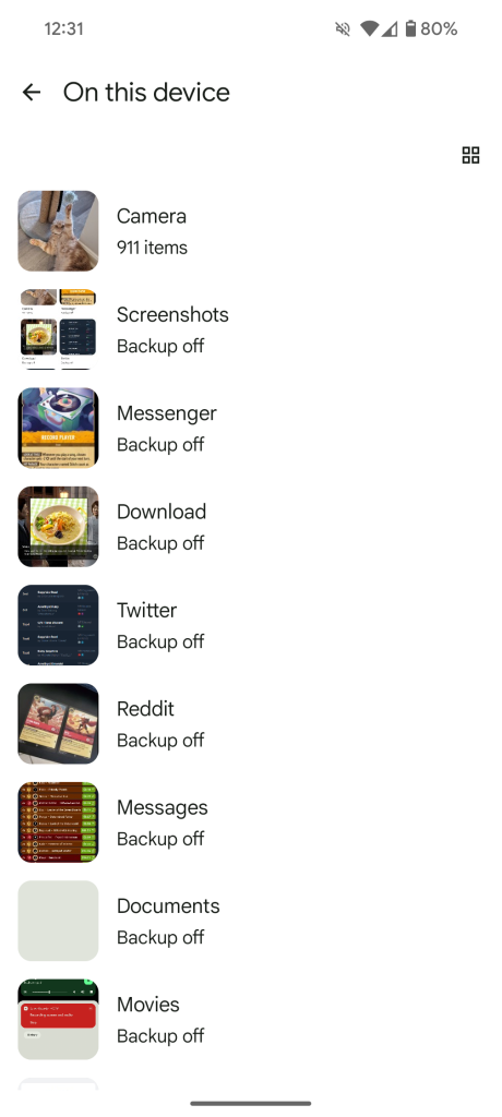 Некоторые параметры, такие как «Люди и питомцы», предлагают тот же опыт, что и при доступе к тому же параметру во вкладке «Поиск». Тем временем другие, такие как «На этом устройстве», были значительно изменены. Под каждой папкой вы теперь увидите, сколько изображений было сохранено, или если резервное копирование отключено. Кнопка в правом верхнем углу позволяет легко переключаться между режимами списка и сетки.