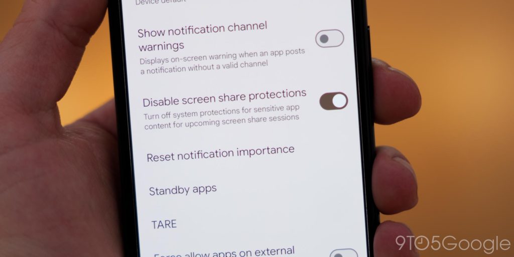 Также появился новый переключатель «Отключить защиту экрана» (Disable screen share protections), который относится к предстоящим системным мерам защиты Android 15 от снимков экрана. Google сообщает нам, что эта опция разработчика не отключает защиты, уже реализованные приложениями, но мы рекомендуем оставить ее включенной («on»), чтобы гарантировать безопасность всего вашего контента на устройстве.