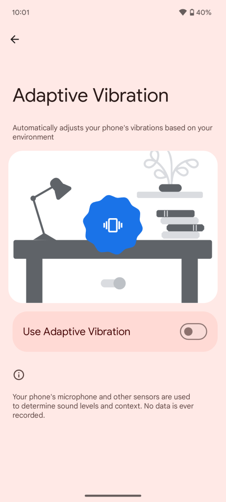 Анимация, показанная на новой странице «Адаптивной вибрации», демонстрирует снижение силы вибрации, когда телефон находится на столе, что подразумевает, что именно так будут действовать телефоны Pixel при включении этой настройки.