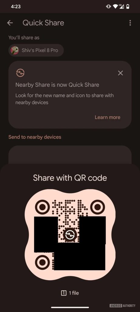 Сотрудники Android Authority обнаружили и включили новую опцию в Quick Share, которая позволяет «Share with QR code» (Делиться с помощью QR-кода). Новая опция, которая еще не доступна в текущих обновлениях Quick Share, генерирует код, который можно отсканировать с другого устройства. Это не передает файл удаленно с помощью кода, а, по-видимому, используется для подключения двух устройств.
