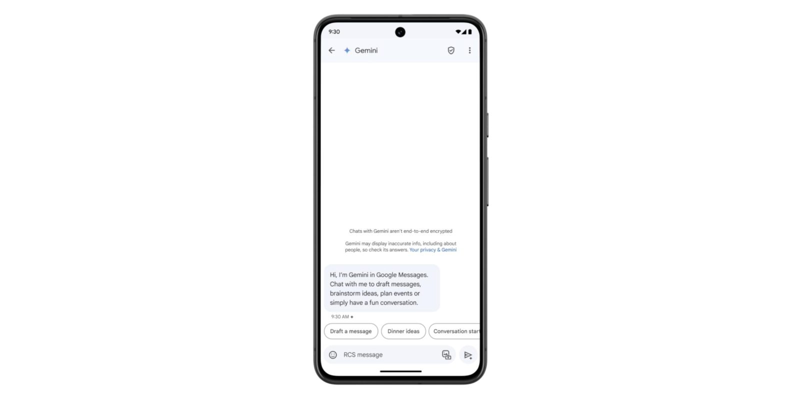 Поддерживаются расширения Gemini, такие как Workspace (@Gmail и т. д.), @YouTube и @GoogleMaps, но «расширение YouTube Music недоступно в Gemini в Google Сообщениях».
