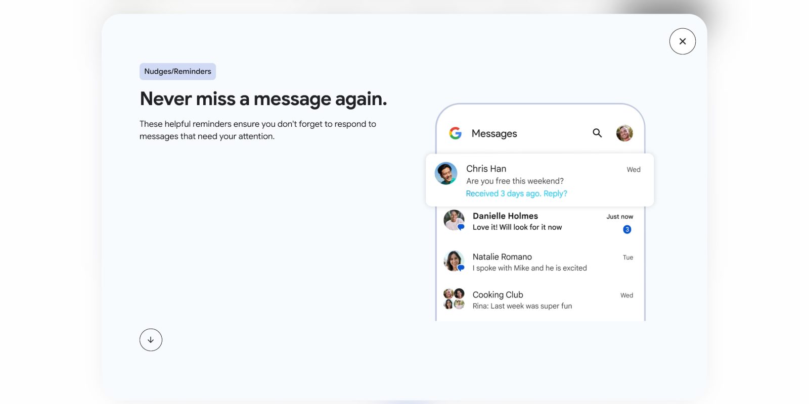 Оригинал от 01.05: Первые «Уведомления» служили «напоминаниями об ответе для последующих действий через определенное время на сообщение, которое вы отправили или получили». Концепция была впервые представлена в 2018 году для Gmail (где она остается доступной). Google Сообщения делали следующее: