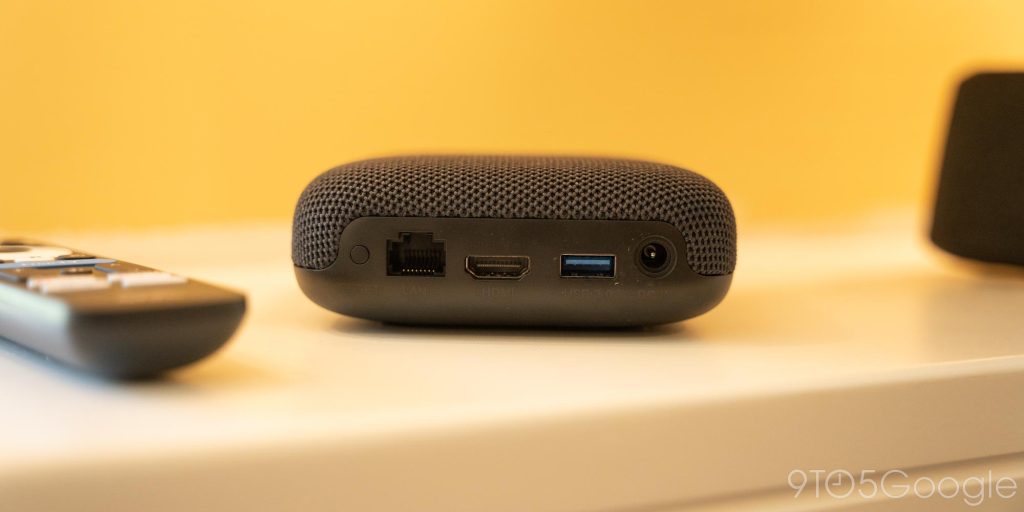 Walmart Onn Pro, тем временем, имеет более толстый, но в целом меньший дизайн. У него есть ткань сверху, чтобы скрыть встроенный динамик и микрофоны, которые могут использоваться для команд «Привет, Google», аналогично умной колонке Nest. Сзади есть четыре порта — Ethernet, HDMI, полноразмерный USB-A и разъем питания.