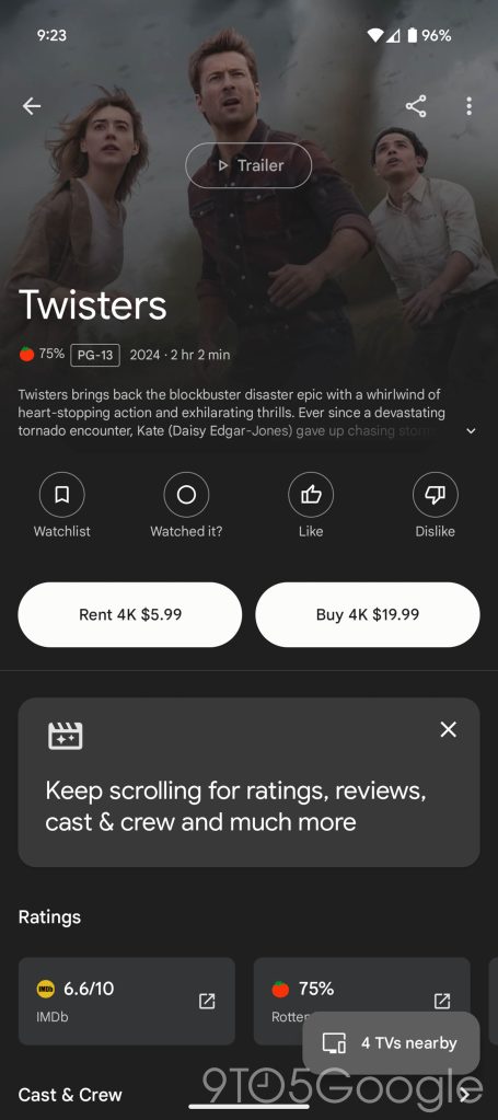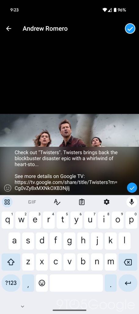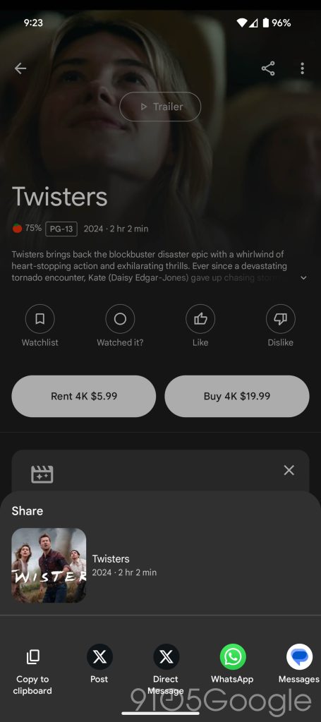 В результате незаметного обновления приложения Google TV теперь можно делиться ссылками на фильмы или сериалы в приложении с кем угодно. Эта функция, уже доступная в приложениях для Android и iOS, отправляет пользователю ссылку, которая открывает определенный фильм или сериал в приложении Google TV, а также изображение постера контента, если вы делитесь напрямую в другом приложении.