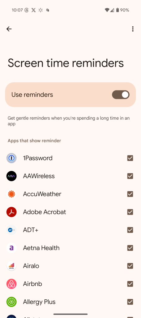 Единственные доступные настройки — это индивидуальные для каждого приложения, поскольку вы можете отключить эти напоминания для выбранных вами приложений. Это может быть полезно для приложений, где вы смотрите видео или играете в игры. После включения «напоминаний о времени использования экрана» на вашем Android-устройстве они автоматически включаются для всех приложений. Нажатие на всплывающее окно предоставляет опцию отключить напоминания для этого конкретного приложения.