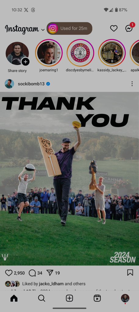 По умолчанию эта функция отключена, но при превышении определенного периода времени появляется небольшое всплывающее окно в верхней части экрана. Мы заметили, что таймер срабатывает через 25 минут в Instagram, в то время как Мишаал Рахман в Twitter/X заметил его через 15 минут в другом приложении.
