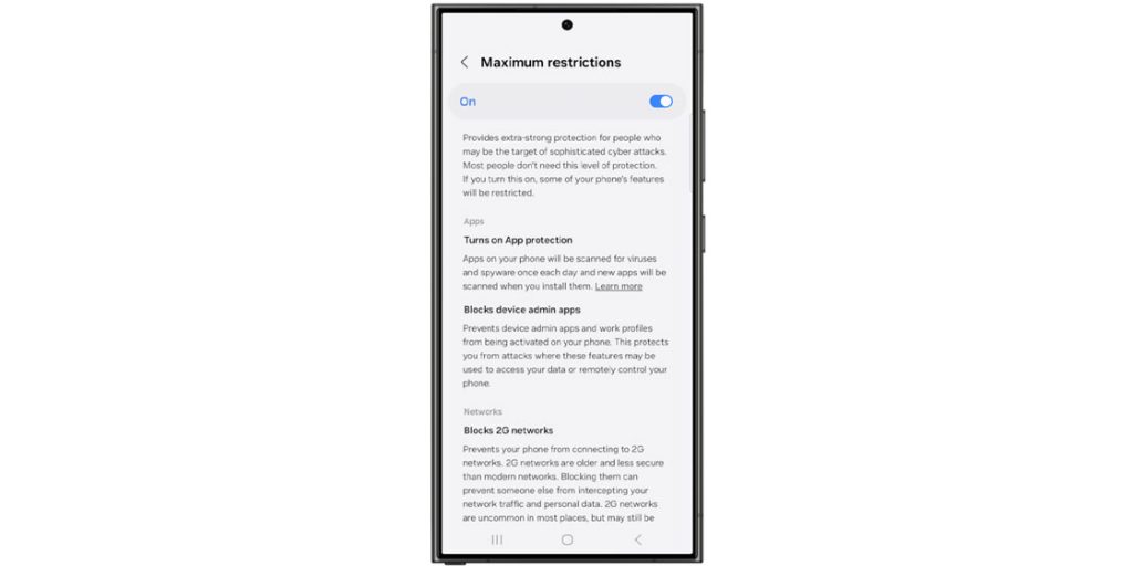 Компания обновляет страницу «Максимальные ограничения» в настройках. Добавлены новые функции для блокировки определенных сетей, такие как возможность блокировки 2G, которая может предотвратить перехват данных при подключении к небезопасным сетям. Непреднамеренные автоматические подключения к Wi-Fi также можно отключить через эти настройки.