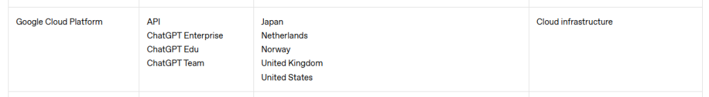 OpenAI отмечает в своем «Списке субобработчиков» («Sub-processor list»), что сервисы Google будут использоваться для корпоративных версий ChatGPT Enterprise, Edu и Team, а также для API OpenAI. Это тот же список продуктов и услуг, что и у других облачных провайдеров OpenAI: Microsoft, CoreWeave и Oracle. Инфраструктура Google Cloud будет использоваться для обслуживания пользователей в США, Великобритании, Японии, Норвегии и Нидерландах.