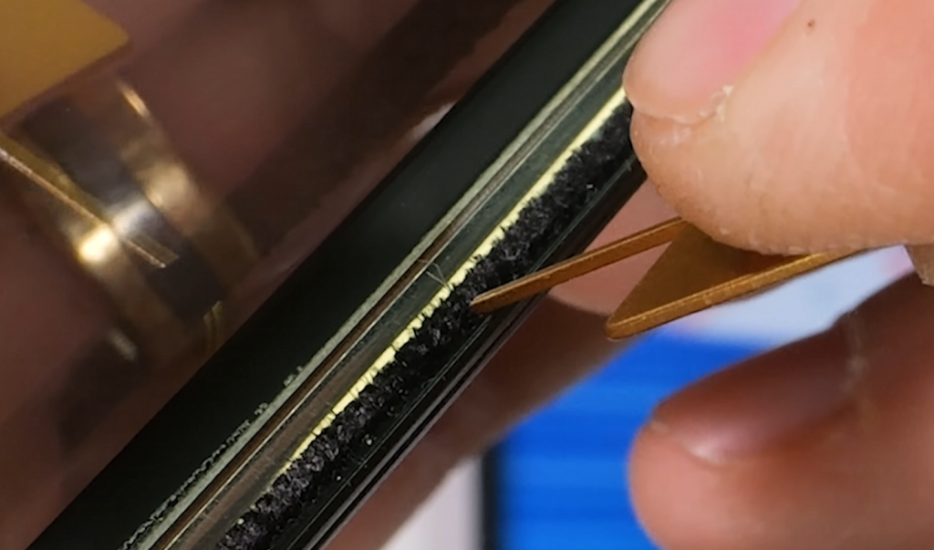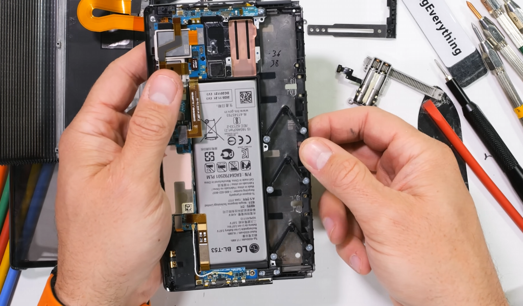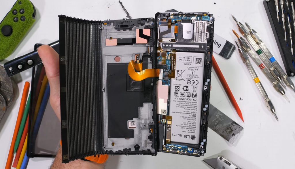 Пара открытых винтов начинает процесс, после чего мы можем увидеть инженерную работу LG. Щетинки внутри заднего стекла удерживают пыль, а «молниевидные» опоры удерживают дисплей на месте, когда он разворачивается и сворачивается.