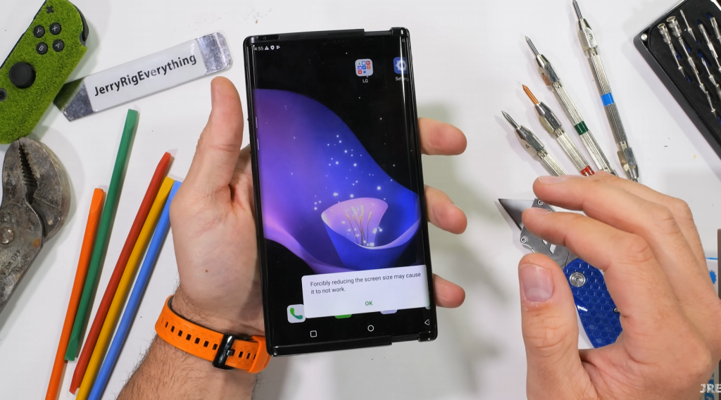 Еще одним уникальным вариантом, над которым работала LG, был Rollable — смартфон с расширяющимся дисплеем, который компания дразнила в месяцы, предшествовавшие закрытию. LG Rollable никогда не выпускался и даже не был официально полностью анонсирован, но одно устройство появилось в сети в 2022 году. Сегодня любитель телефонов-пыток ДжерриРигЭверисинг также получил устройство для съемки, включая подробный взгляд на инженерную разработку этого устройства, которая делает его гораздо более реальным.