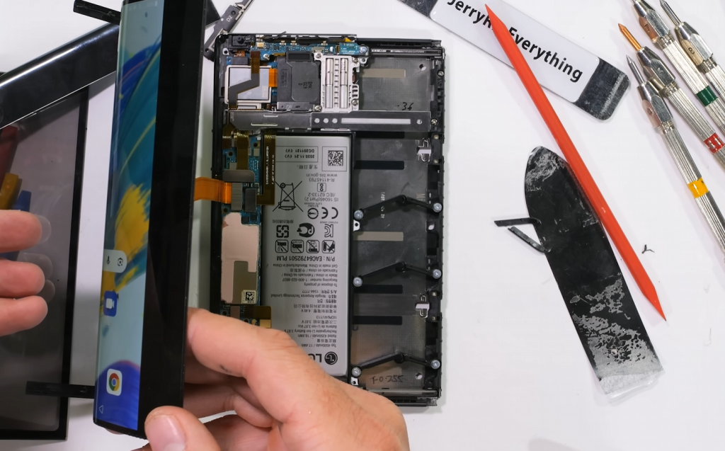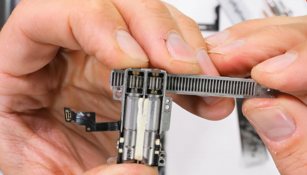 Самое интересное здесь — это увидеть открытый мотор, толкающий раму устройства, чтобы дисплей мог расширяться. Быстрое движение по разобранному устройству показывает, как маленькие пружинные рычаги внутри расширяют раму, когда мотор движет устройство в любом направлении.